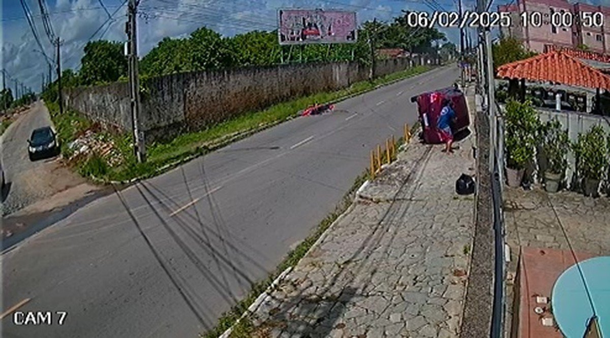 Um carro capotou após ter sido perseguido por uma moto e atingido por tiros, na manhã desta sexta-feira (7). Dentro do veículo estavam duas pessoas e uma delas morreu. Câmeras de segurança registraram a ação.