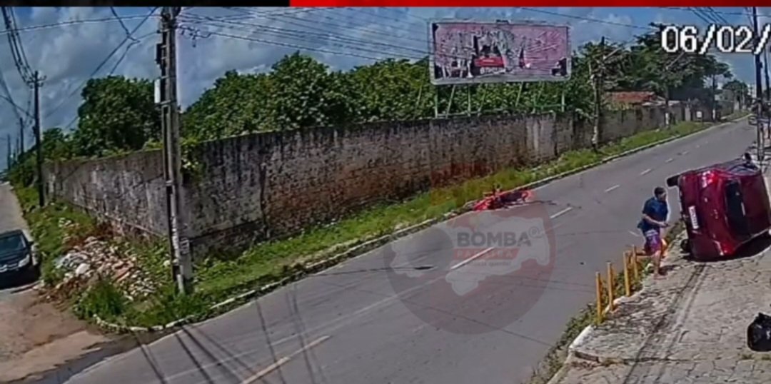 Metros à frente, o condutor acabou capotando o veículo, quando o piloto da moto desce e vai em direção ao carro para efetuar tiros.
