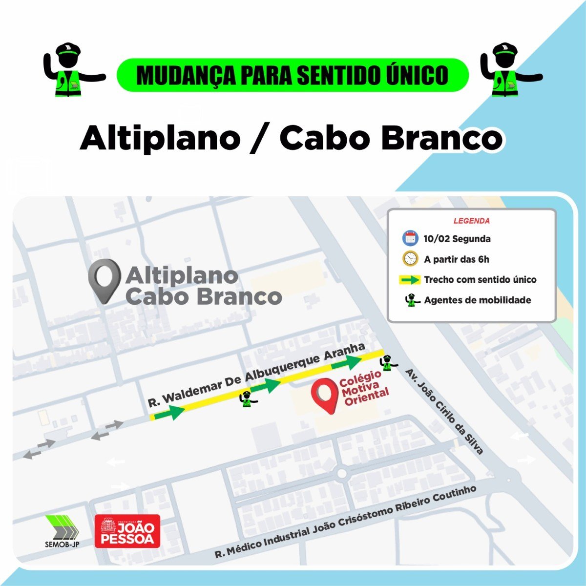 Nossos técnicos avaliaram o pedido e fizeram os estudos necessários para melhorar o trânsito e proporcionar mais segurança no local. Toda a sinalização já foi implantada, aguardando apenas a próxima segunda-feira (10) para iniciar”, afirmou Marcílio do HBE, superintendente da Semob-JP.